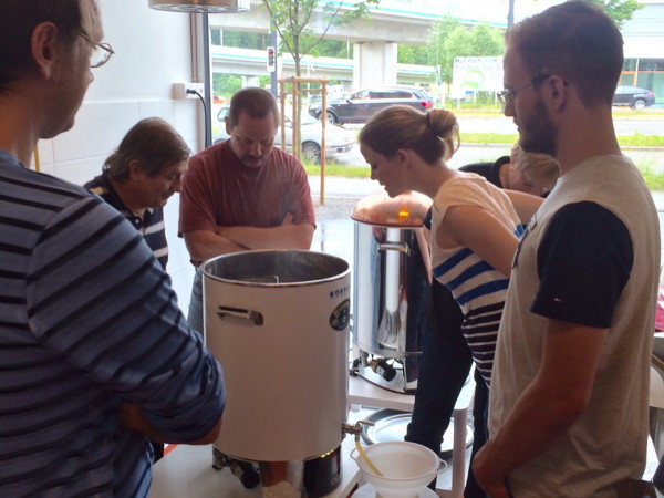 Das Seminar dauert vier Stunden, in denen die vorbereitete Maische abgeläutert, die Würze mit Hopfen gekocht und dann nach dem Whirlpool in das Gärfass abgefüllt wird.